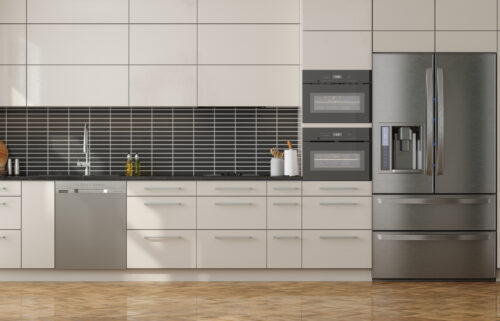 Modern Kitchen Interior With Front View Of Cabinets, Refrigerator, Dishwasher And Oven
