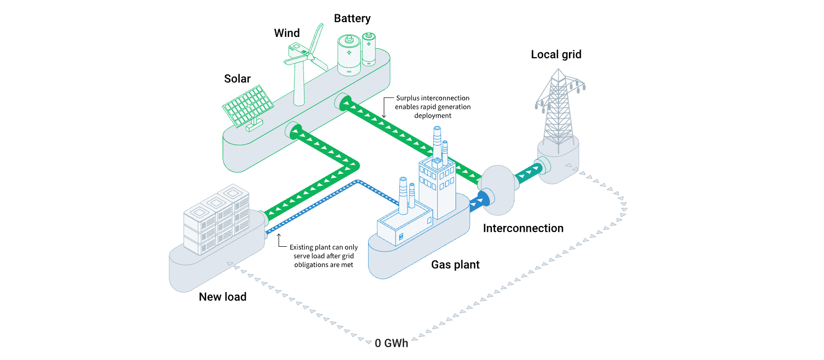 These new clean energy resources are sized to meet the demand of the new load and can send surplus energy to the grid.