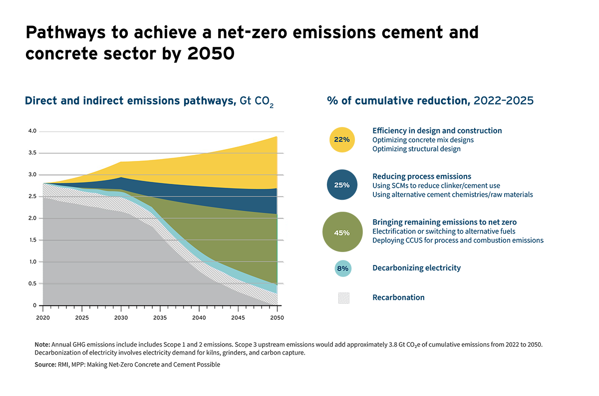 Innovations across the “make less,” “make better,” and “make new” categories are already being deployed today, but scaling these technologies is critical to reducing emissions long-term. According to the Making Net-Zero Concrete and Cement Possible report, carbon capture, utilization, and storage (CCUS) will also be required to achieve net-zero emissions in the sector, with the potential to capture roughly 39 percent of cement sector emissions by 2050, but only if the necessary supporting infrastructure is developed. While CCUS is a critical component for fully decarbonizing cement, it is not a silver bullet: high capital and operational costs, along with logistical challenges such as carbon dioxide transport and storage, make large-scale deployment difficult today. By combining these innovations with technologies such as CCUS, the sector can take a holistic approach to decarbonization, addressing emissions across the value chain and contributing to a fully decarbonized built environment.