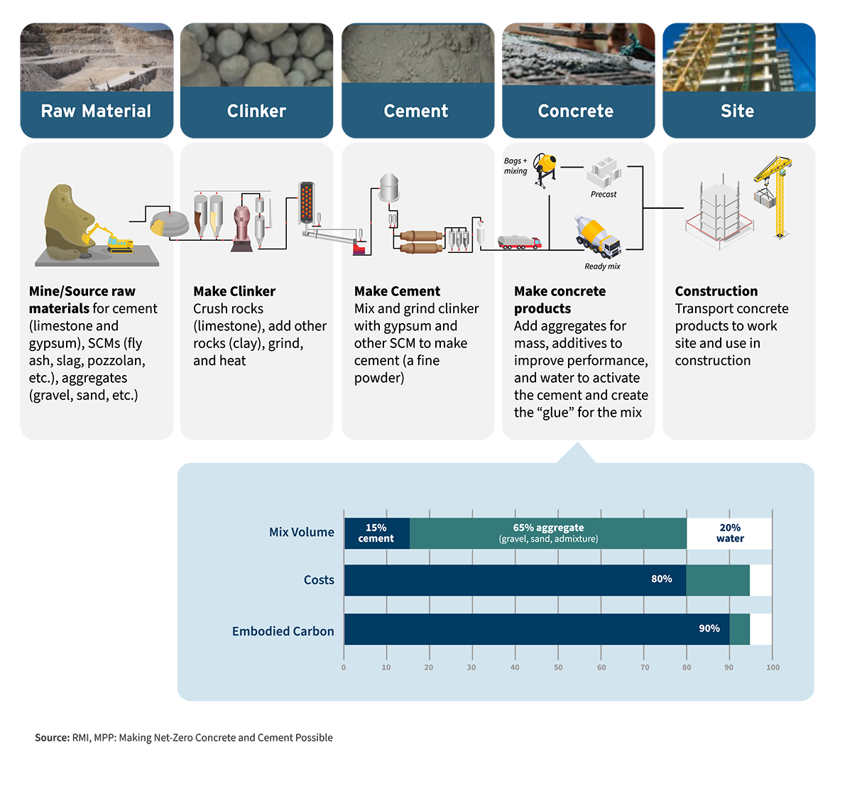 Concrete’s global scale and the highly local nature of its production both shape the decarbonization challenge. While cement is often exported internationally, concrete is made close to where it will be used. Concrete is heavy and starts to harden as soon as it is mixed, making it impractical to transport over long distances. Production and consumption are therefore closely tied to local demand, available materials, and policy environments, creating highly regionalized markets that require locally tailored solutions.