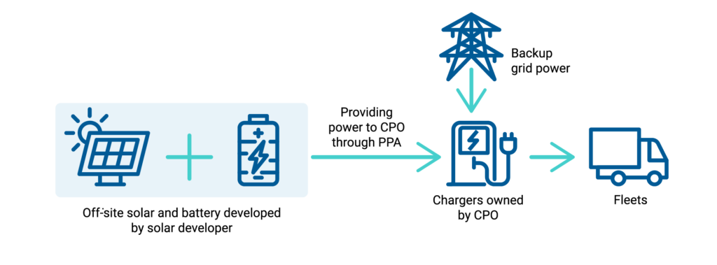 Other options also exist for industrial consumers to source clean electricity, although they may only apply to specific use cases within the logistics sector. For example, a third-party renewable energy developer can install and operate an on-site solar and battery system exclusively for a charging site, with the CPO purchasing electricity from the developer through a PPA. This model suits CPOs that do not want to take on high up-front capital costs. However, the overall cost of operating a solar-based charging station may be higher due to the involvement of a third party. Another option is the group captive model, in which several electricity consumers jointly develop a solar plant to meet their own energy needs. This approach suits stakeholders with available land and significant demand for solar energy, potentially beyond EV charging, such as ports.