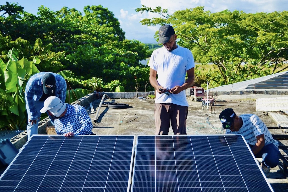 Community members in Nizao being trained on rooftop solar installation