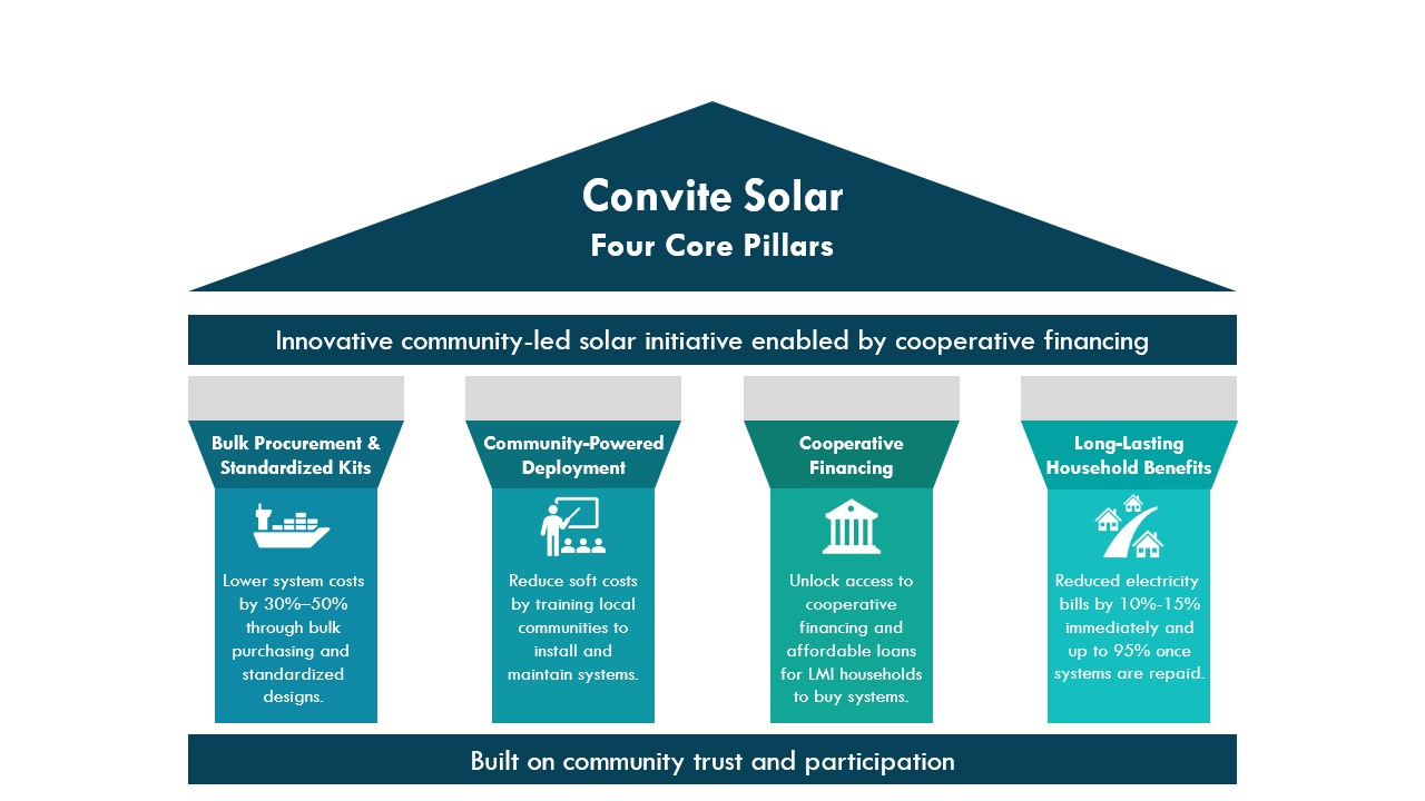 In Dominican tradition, convite refers to a community gathering where neighbors work together to achieve a common goal. Convite Solar applies this cultural idea of communal support to installing and maintaining rooftop solar systems. At its core, the model reimagines rooftop solar as modular and standardized, designed for guided community installation rather than exclusive reliance on specialized contractors.